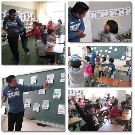 英語をつかって、あいさつゲーム、自己紹介ゲーム、好きな色さがしなどをしました。