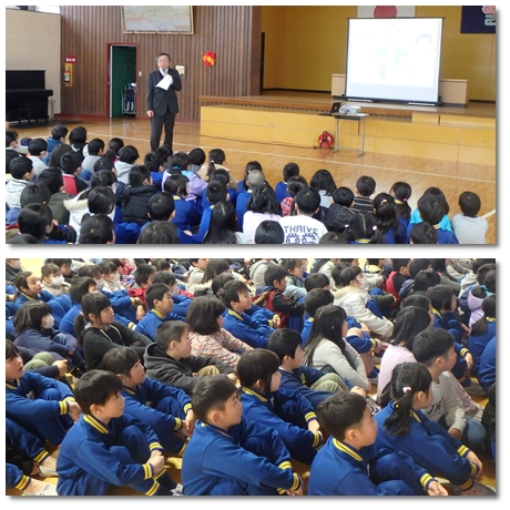 体育館に全校児童が集まり、校長先生からお話がありました。