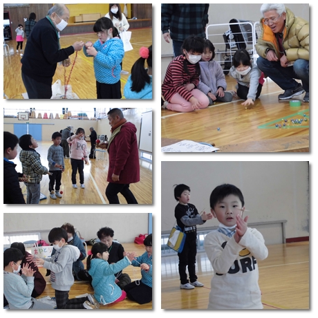 けん玉、竹とんぼ、竹ぽっくり、あやとり、めんこ