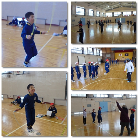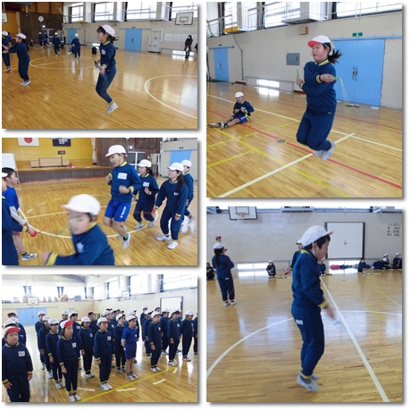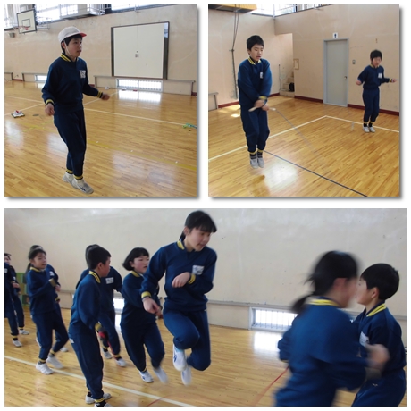最初の3分間持久跳びでは、たくさんの児童が目標を達成し、