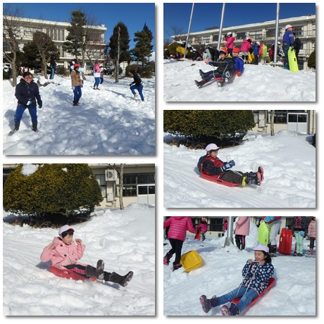 一方、1~3年生は校庭の土手を利用してのそりすべり。