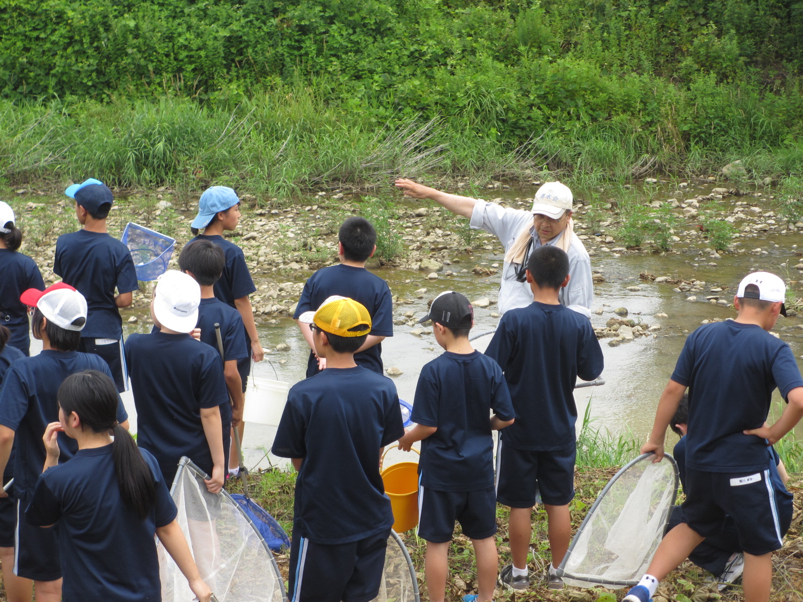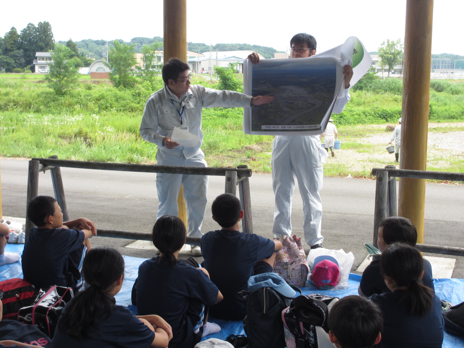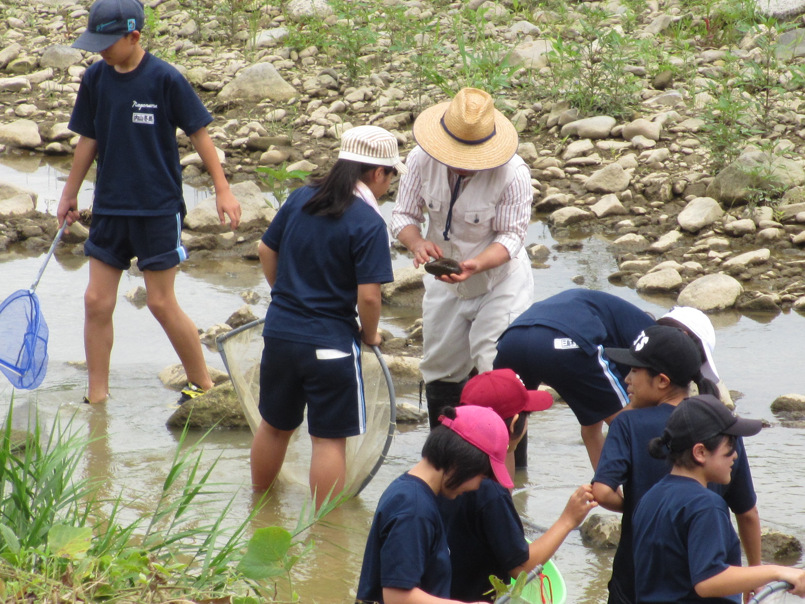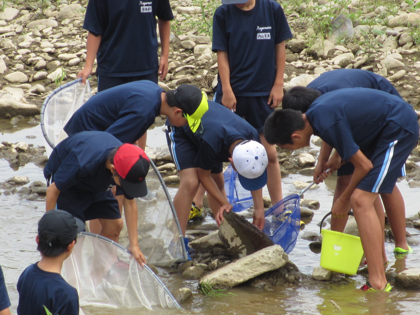 2018年7月11日 12時56分本日、1年生は「江花川学習」の総まとめとして、江花川の河川敷に実際に足を運び、学習を行いました。はじめに県土木事務所や市役所の方々から河川の環境整備や生活用水の浄化等についての説明を聞き、その後実際に江花川の水質を調査したり、生息する生物を捕獲・確認したりして、我がまち長沼を流れる「江花川」の環境について様々な角度から考えることができました。
