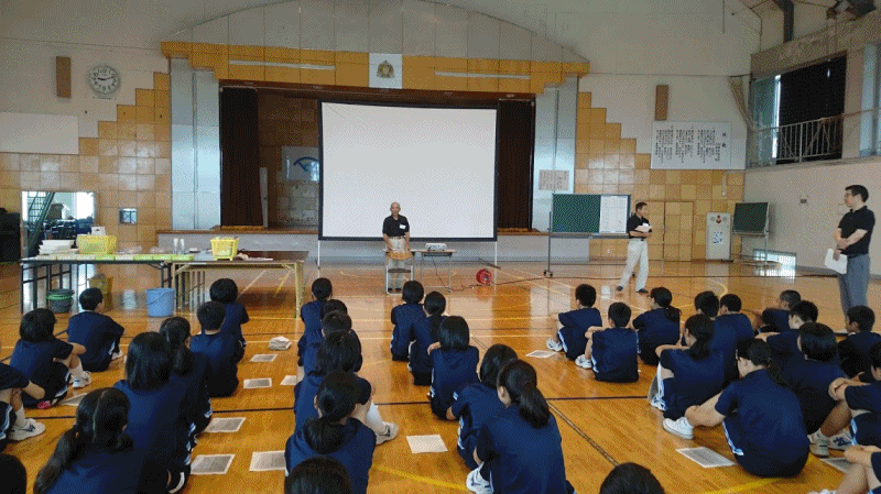 2016年7月13日 17時00分 生憎の天候のため江花川せせらぎ公園で行うはずであった実地調査を体育館に