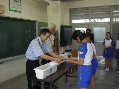 各学級代表の児童、飼育栽培員会の出席で 花の種(あさがお、ジニア(百日草)) 他を