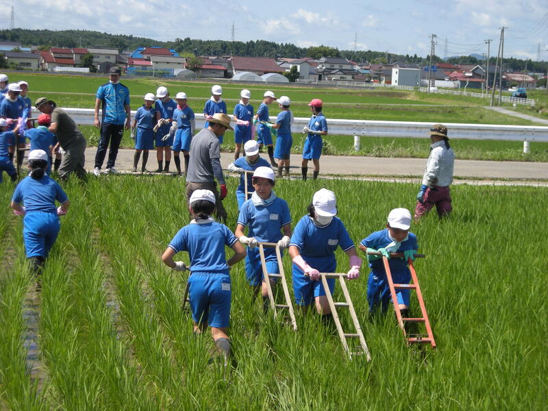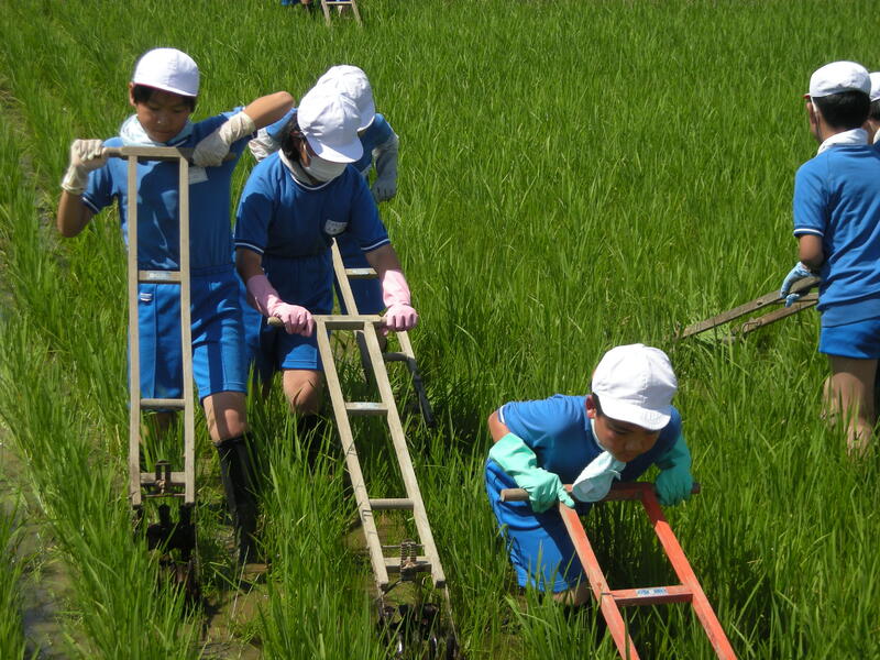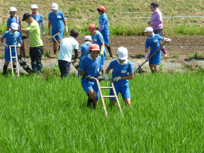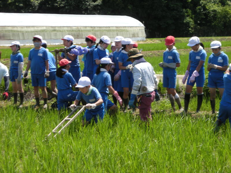 2023年6月30日 06時58分5年生が学校田の草取りを行いました。地域の方に「田車」の使い方を教えていただきながら一生懸命取り組みました。