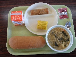 献立:コッペパン,牛乳,春巻き,とうもろこし,かき玉汁,マーシャルビーンズ