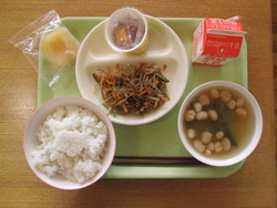 献立 : 麦ご飯,牛乳,納豆,金平ごぼう,ふ入りみそ汁,アップルコンポート