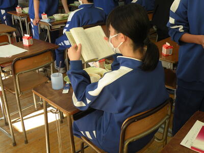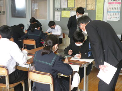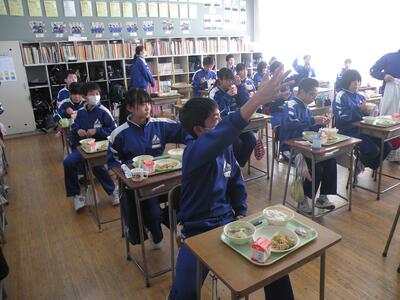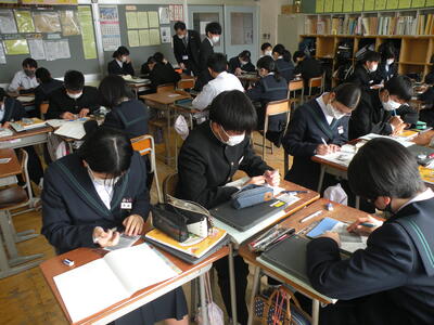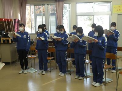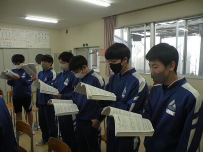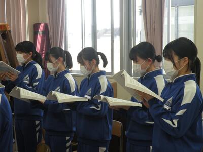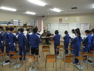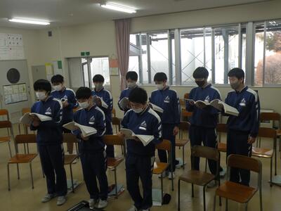2022年1月25日 14時45分3年1組の音楽の授業では卒業式の式歌練習をしています。今日は私立高校の入試で学年30名の生徒が不在(受験)です。しかし、少ない人数の中、男女共一生懸命に歌っていました。横で静かに聴いていて、とても感動しました。3月11日の卒業式、あっという間ですね・・・。