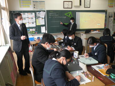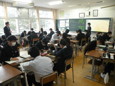 2022年1月26日 10時30分須賀川市教育委員会教育研修センターの指導主事の先生をお招きし、2年1組の数学の授業を参観いただきました。「協同的な学び」が定着してきており、グループや近くの生徒と意見交換しながら課題解決に迫っていました。
