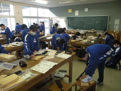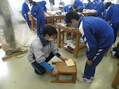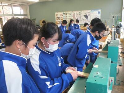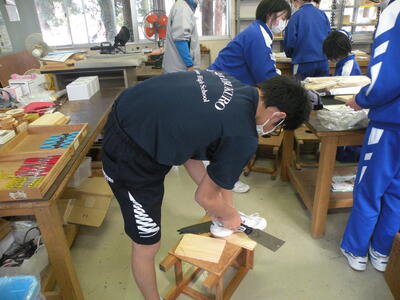2022年1月26日 11時30分1年生の技術の授業では、生活に役立つもの(本立て・CD立てなど)を製作しています。木材をのこぎりを使って切る作業や電動のやすり機を使って木を削る作業等、苦戦していたようです。世界にたった1つの自分だけの作品です。今から完成が楽しみです。けがをしないように慎重に進めてください。