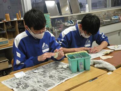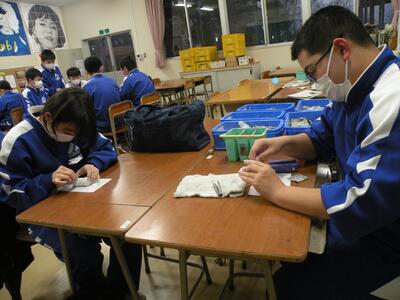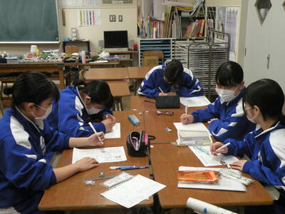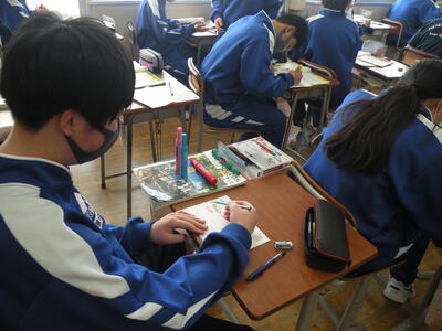 2022年1月20日 17時00分美術室を覗くと、美術部員が活動していました。「何をしているの」と尋ねると、4月に入学してくる新入生向けてのチラシを作成しているとのことでした。また、3年生4名はまだ完成していない美術の作品を製作していました。生徒たちとの会話をとおして、いろいろなことが分かりますね。本当に楽しいひと時です。