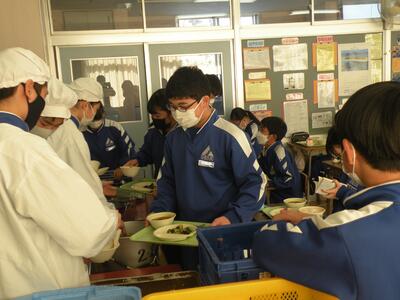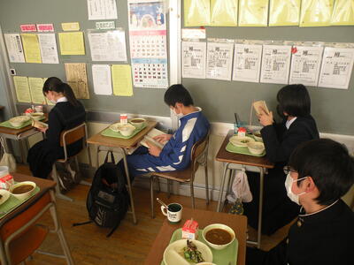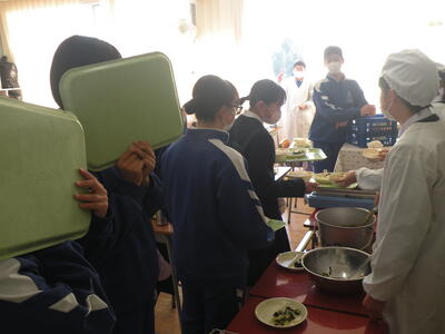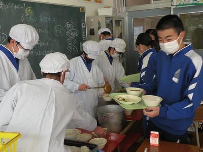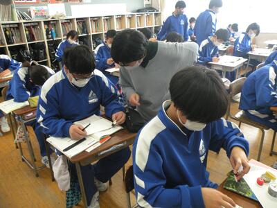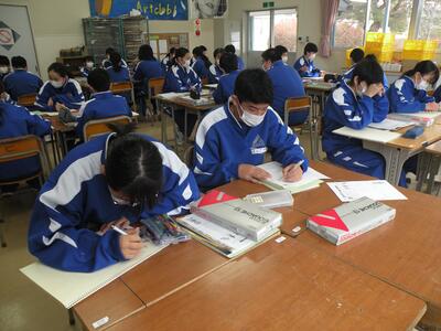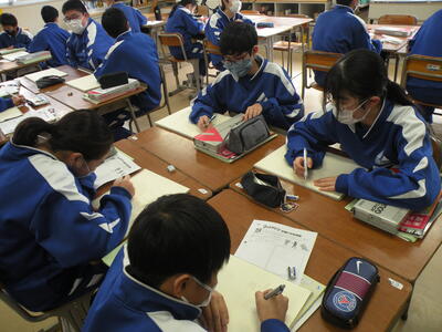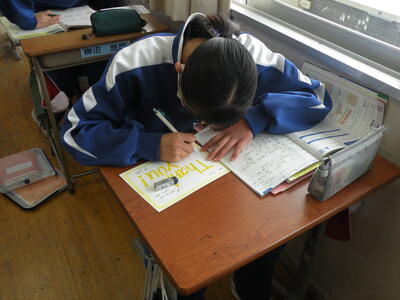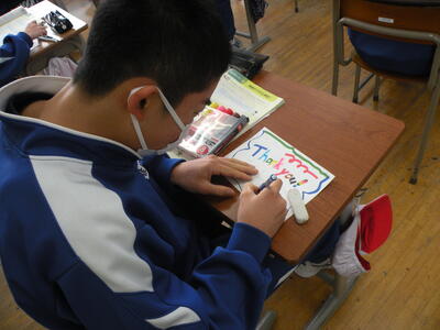 2022年1月21日 09時40分英語の授業ではALTの先生に御礼のメッセージカードを作成しました。所定の用紙に英語でメッセージを記入し、色ペンなどを使いながらきれいに仕上げることができました。給食のときのような賑やかさはなく、みんな授業に集中していました。すばらしい態度でしたよ!