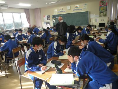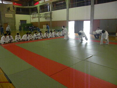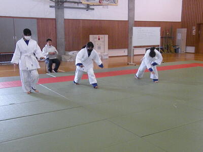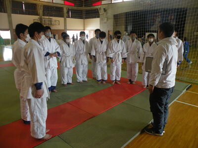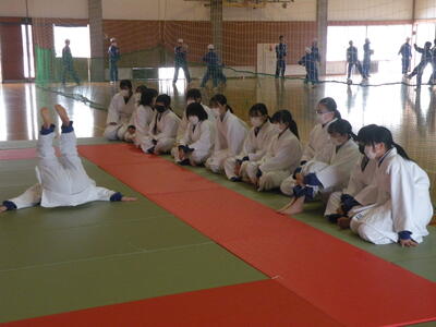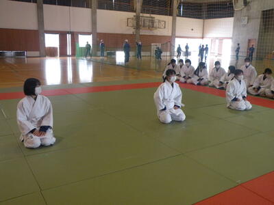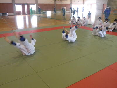 2022年1月21日 11時20分今日は礼法と受け身(前・横・後ろ・前回り)のテストです。男子・女子の順で行いました。男子も女子も柔道着姿はとても凜々しく見えます。生徒の中には柔道部の生徒のように、とても上手な生徒も見られました。でも、足がとても冷たそうでした。