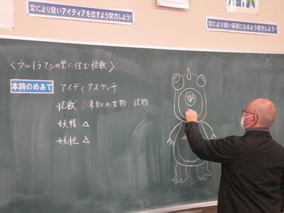 2022年1月24日 10時30分今日から新しい単元に入りました。紙粘土を使って「ウルトラマンの里に住む怪獣」を作ります。今日はアイデアスケッチ、思いつくものをたくさんスケッチブックに描いています。どんな怪獣が完成するのか、今からとても楽しみですね!