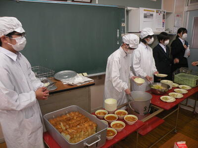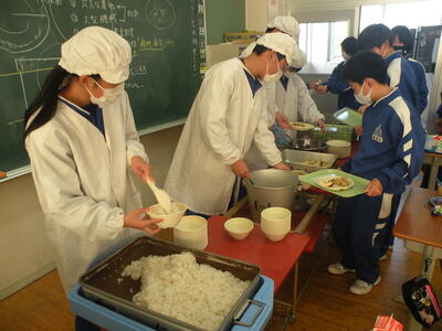 今日のメニューは、麦ごはん・車麩の煮物・ひじきサラダ・ふりかけ・牛乳でした。今学期もあと3回の給食となりました。調理員の皆さん、ありがとうございました。生徒の皆さんはよく味わって食べてくださいね。今日は3年生教室を訪問しました。1組では数名勉強している生徒が見られました。