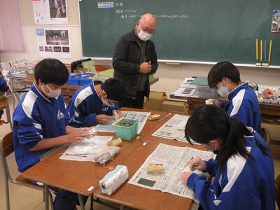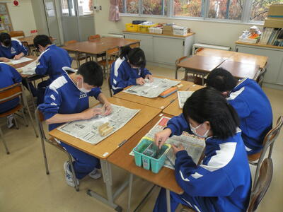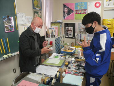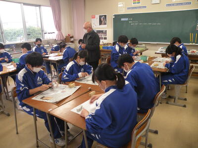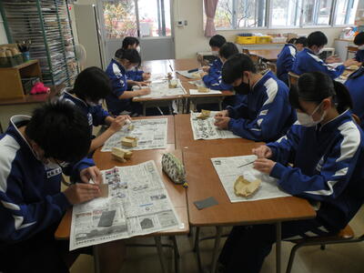 2021年11月22日 12時05分3年1組の美術の授業では、教科担任の先生のご助言をいただきながら、仕上げに入ってきた生徒が見られます。紙やすりを濡らしながら磨きをかけ、石の表面はツルツル状態です。どの生徒も集中力がすごく、細部にわたり丁寧に削ったり、磨いたりしていました。
