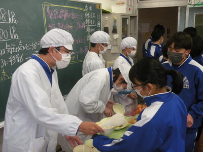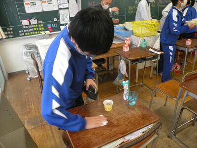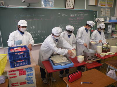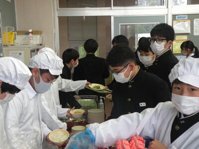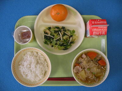 2021年11月22日 12時50分今日のメニューは、麦ごはん・肉じゃが・納豆・ほうれん草のおひたし・みかん・牛乳でした。今日は生憎の雨模様、気温も低いため肉じゃがはとても美味しかったです。今日は2年生の教室を訪問しました。食べる前の机を一生懸命に拭いている生徒がいました。えらいですね!