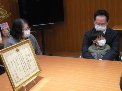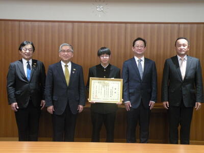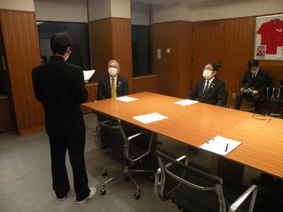 2021年11月22日 17時25分「税の作文」で国税庁長官賞を受賞したことについて、須賀川市長橋本克也様にご報告をさせていただきました。校長より受賞者の紹介をさせていただきました。受賞者の両親と弟さんにも同席してもらいました。橋本市長様からは心温まる激励のお言葉をいただきました。今日の報告会を糧に、更に大きく成長してくれることと思います。橋本市長様、お忙しい中ありがとうございました。