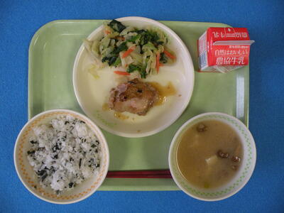 2021年11月24日 13時30分今日のメニューは、わかめご飯・鶏肉の香味焼き・キャベツとほうれん草のごま和え・なめこ汁・牛乳でした。11月24日は「いいにほんしょく」と読み、和食の日だそうです。皆さんは知っていましたか。今日は給食メニューのみ掲載させていただきます。