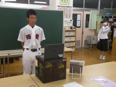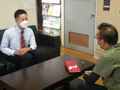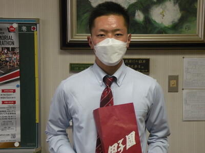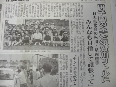 2021年9月27日 16時30分夏の甲子園で大活躍した日大東北高校3年生、本校の卒業生が甲子園出場の挨拶並びに後輩への指導に来てくれました。久しぶりの恩師との再会では甲子園での投球について、卒業後の進路などについての話題で盛り上がりました。校長室には記念の甲子園の土をいただきました。また同日の新聞にも掲載されていました。本当にすばらしい先輩です。ありがとうございました。