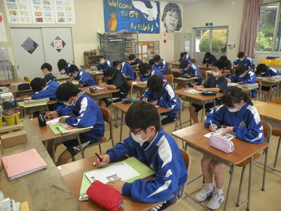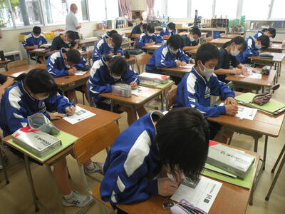 2021年9月27日 14時35分今日は何を作成しているのかな?と美術室に入ると、いつもに増して生徒たちはすごい集中力で何かを描き上げていました。ふと黒板を見ると、今日のめあては「デザイン画のテスト」と書いてありました。一人ひとりの作品を覗かせてもらうと、みんなとても上手でした。