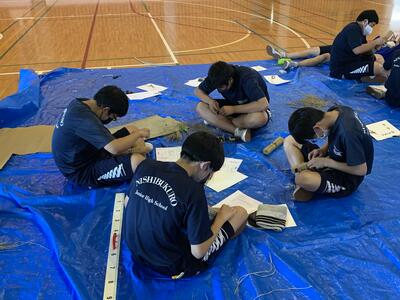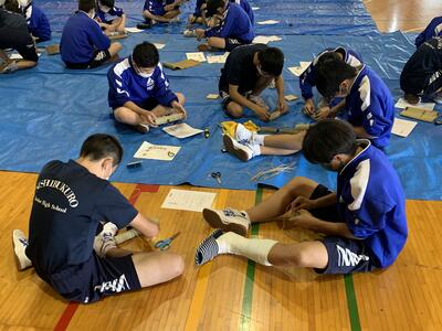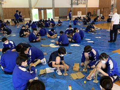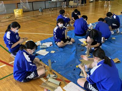 2021年9月22日 13時30分本日の3,4校時は総合体験活動の時間で、3年生は今年度中止になった松明づくりの代わりにミニ松明の作成を行いました。どの生徒も熱心に集中して作成していました。