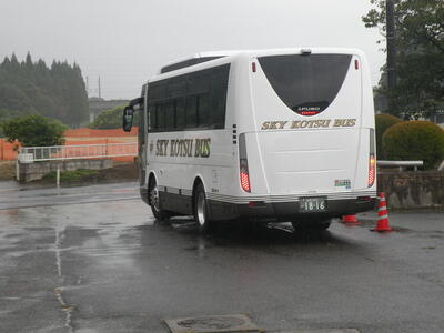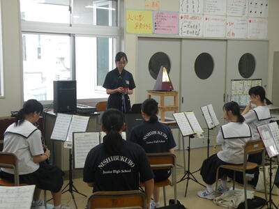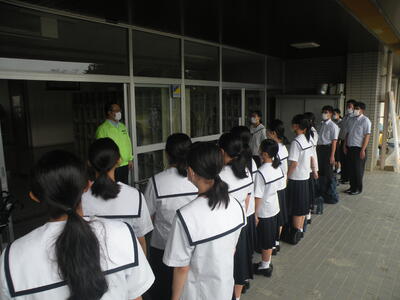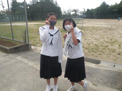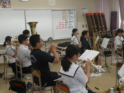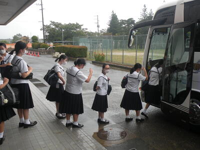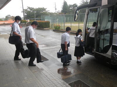 2021年9月16日 14時00分吹奏楽部員が小雨の降る中、元気に出発しました。演奏は16時です。今までの練習の成果を発揮し、楽しい音楽を奏でてください。みんなの表情がたいへんに良かったです。頑張れ西中。頑張れ吹奏楽部員。
