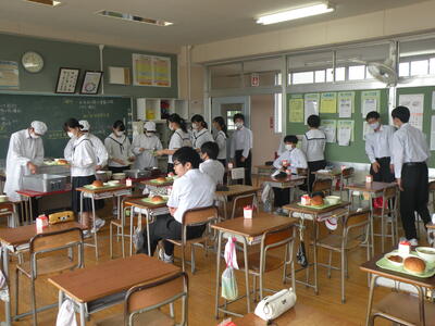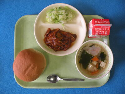 2021年9月14日 12時45分今日のメニューは、丸コッペパン(スライス)・ボイルキャベツ・ハンバーグトマトソース・わかめスープ・牛乳でした。ハンバーグもいいですね!マックのキムタク気分でいただきました。今日は3年生の教室を訪問しました。みんな今日の天気のようにとても爽やかでした。
