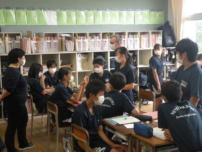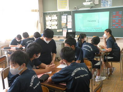2021年9月16日 10時25分2年3組の英語の授業ではALTとのTT授業でした。みんないろいろな所を発表していました。アクアマリン・牡丹園・・・中には、ヨークベニマルや山寺公園などもありました。みんなとても楽しそうでした。