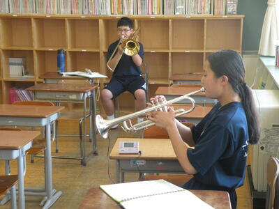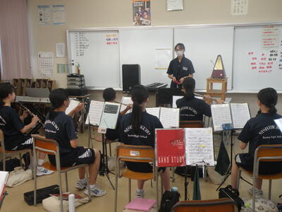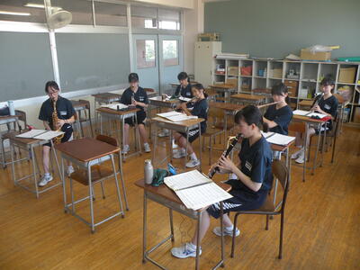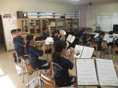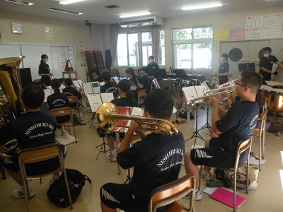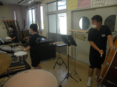 2021年8月4日 10時00分パート毎の練習後、全体練習となりました。リーダーを中心に、それぞれの音を確認し合いながら、一生懸命に取り組んでいます。各楽器の音色もとてもきれいで、日々上達していることが分かりました。9月の小中学校音楽祭(合奏)に向けて頑張ってくださいね!