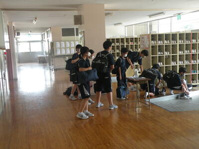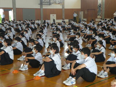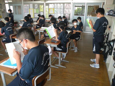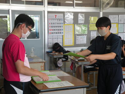 2021年7月20日 13時30分中学校に入学して初めての通知票を担任の先生よりいただきました。どの生徒も緊張した様子でしたが、通知票を開けた瞬間、「まずまずだね。」「ああ・・。」と言う声が聞かれました。これを基準にして更に頑張ればいいことです。今のこの新鮮な気持ちをいつまでも忘れないことが大事です!みんなの爽やかな笑顔がこの暑さを吹き飛ばしてくれています!