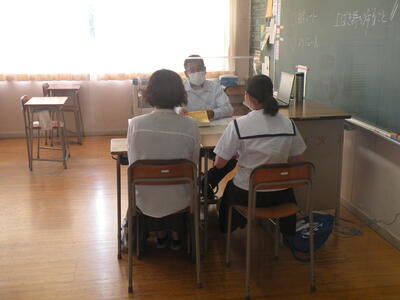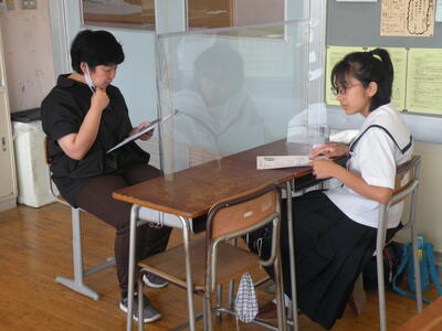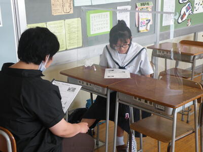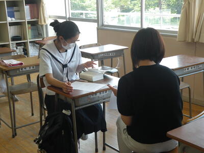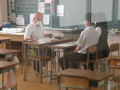 2021年7月21日 15時00分いよいよ進路選択に向けての「三者教育相談」が始まりました。どの生徒も保護者の皆様も緊張した様子ですが、リラックスしてご参加ください。また、いつでも何かありましたら各担任までご相談ください。1、2年生も希望者に限り、三者または二者教育面談を実施しています。暑い中、ご来校いただきありがとうございます。