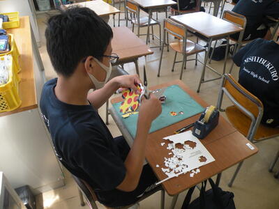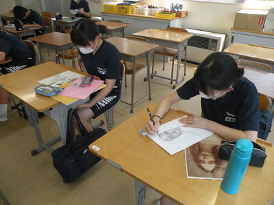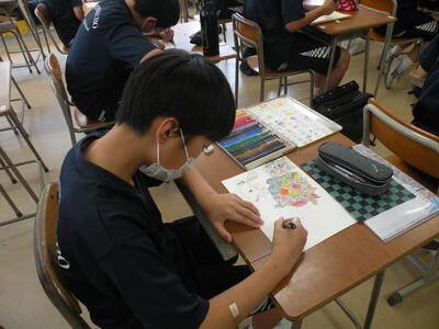 2021年7月21日 10時45分美術室を訪問しましたら、みんな静かに学習に励んでいました。あれ?3年生の学習会かなと思いましたら・・・、美術部では学習(宿題)の時間・タブレットを使っての調べ学習・美術の制作の時間とで分けて活動をしていました。なるほどと感心させられました。みんな頑張っていました!