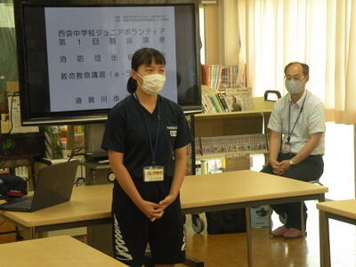2021年7月21日 15時20分西袋公民館長様をお迎えし、今年度のジュニアボランティア養成講座の開校式が行われました。11月まで全8講座が予定されており、12名の受講生が集まりました。今日は開校式・オリエンテーション、須賀川消防署の方を講師にお迎えし、救急救命講習会(学科)が行われました。