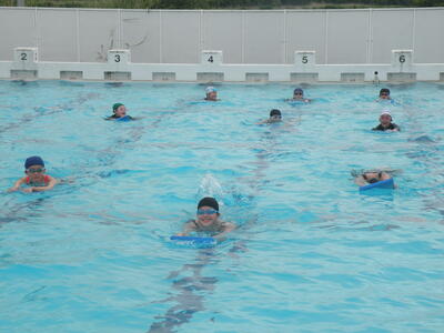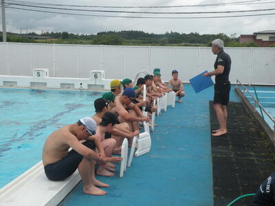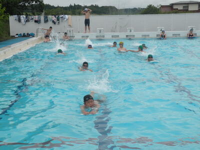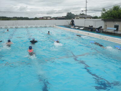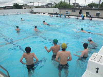 2021年6月30日 12時05分ビート板を使ってのバタ足練習や腕だけを使ってのクロール練習をしました。男女ともに小学校時代の泳ぎの成果が表れ、どの生徒もたいへんに上手でした。ちょっと肌寒い時もありましたが、みんな元気に一生懸命に泳いでいました。
