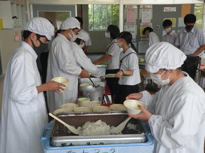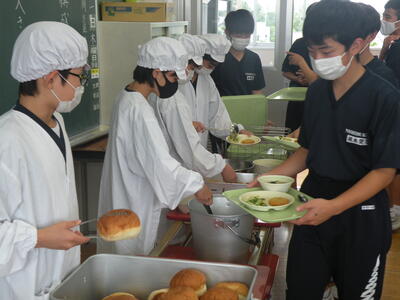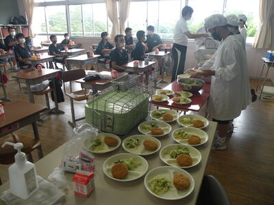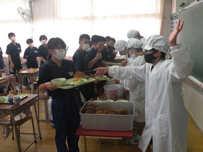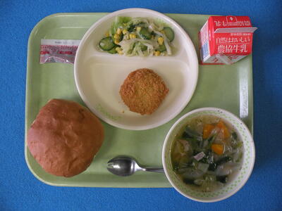 2021年7月1日 12時40分今日のメニューは、丸パン(スライス)・メンチカツ・ソース・キャベツのサラダ・コンソメスープ・牛乳でした。メンチカツをパンに挟めて美味しくいただきました。今日は1年生の教室を訪問しました。4組男子はいつ訪問しても、おもしろい生徒がたくさんいてとても楽しいです。