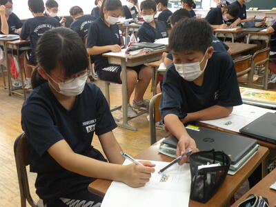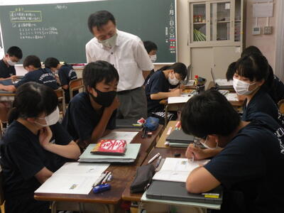 2021年6月30日 15時10分連立方程式について学習しています。まずは自分で考え、計算式を導き出し、その後グループで話し合い・確認し合っていました。より自分の考えが深まっていたように思いました。話し合い活動にも慣れ、日常化しているようです。