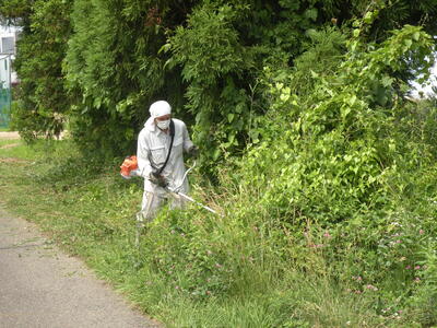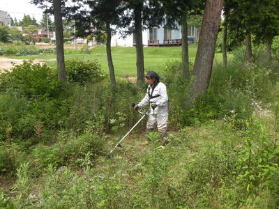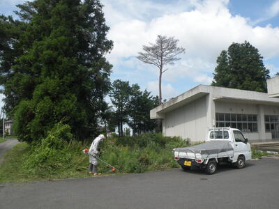 2021年6月30日 15時25分本校には松くい虫被害を受けた松が2本あります。早速、市の教育委員会に連絡を入れたところ、明日・明後日にでも伐採していただけることとなりました。今日は業者の方がその準備で下草刈りを行いました。素早い対応に感謝いたします。ありがとうございました。※松くい虫被害は、「マツノザイセンチュウ」という体長1ミリメートルにも満たない線虫が松の樹体内に入ることで引き起こされます。(枯れる)