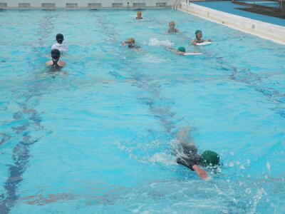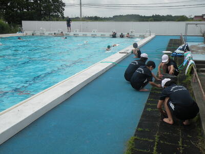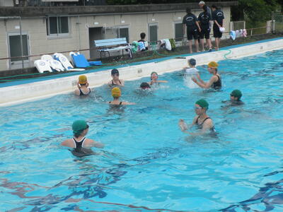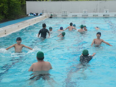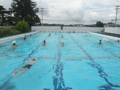 2021年6月30日 12時05分ビート板を使ってのバタ足練習や腕だけを使ってのクロール練習をしました。男女ともに小学校時代の泳ぎの成果が表れ、どの生徒もたいへんに上手でした。ちょっと肌寒い時もありましたが、みんな元気に一生懸命に泳いでいました。