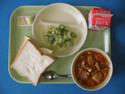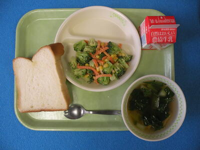 2021年6月29日 12時30分今日のメニューは、バター食パン・ブロッコリーサラダ・ハムとチンゲン菜のスープ・牛乳でした。今日はメニューのみの紹介とさせていただきます。明日は3年生の給食の様子を掲載する予定でいます。