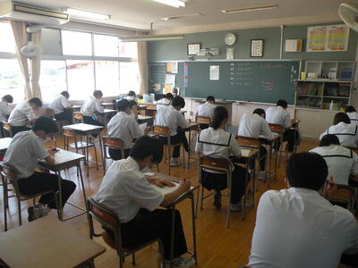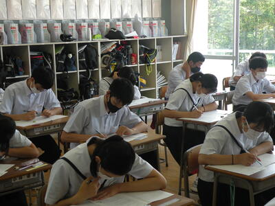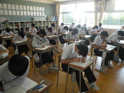 2021年6月28日 10時00分3年生は実力テスト(5教科)を行っています。これから月1回の割合で行われる予定です。このテストはどこの学校でも実施しており、高校選択の際のめやすとなるものです。1教科50点の250点満点、1点でも多くとれるよう最後まであきらめずに取り組んでください。頑張れ、3年生!!