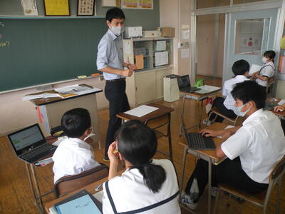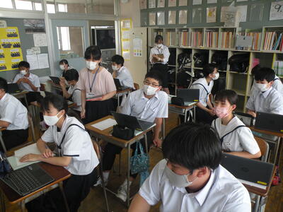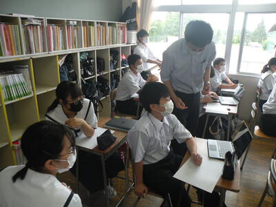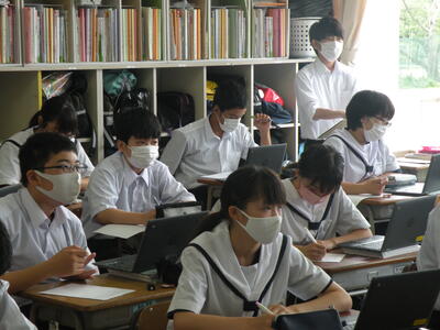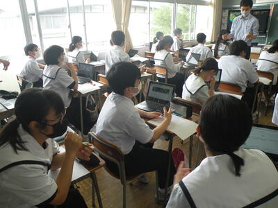 2021年6月28日 10時15分今日は福島県教育センターの先生2名をお迎えし授業を実施しました。本校の研究テーマでもある「協同的な学び」をうまく取り入れた授業でした。タブレットを使用しながら疑問点や分からない点は近くの友だちに聞きながら課題解決をしていました。手を挙げて積極的に発言する生徒が多く見られました。とても楽しそうでした!