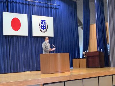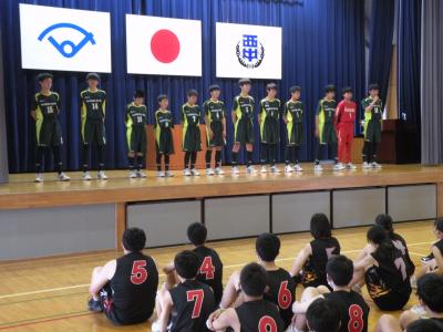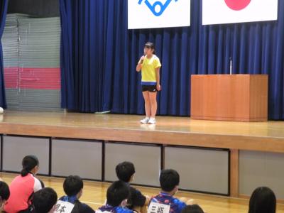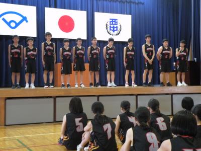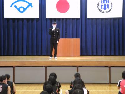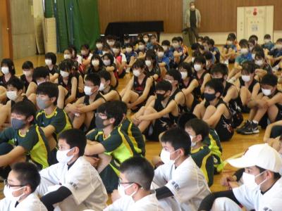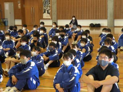 2021年5月28日 15時40分来週の中体連総合大会の壮行会が行われました。校長挨拶後、各部の部長より選手紹介と決意表明を行いました。(マイクはその都度消毒あり)選手の皆さんはステージ上のみマスクを外しました。どの部もすばらしい発表でした。大会当日は全力で頑張ってほしいと思います。