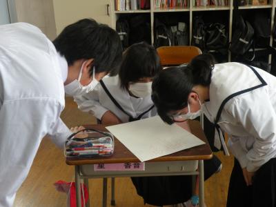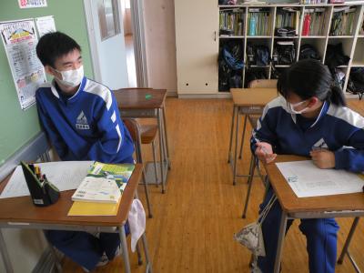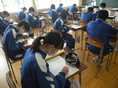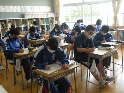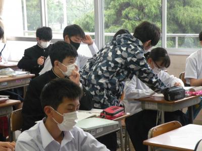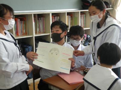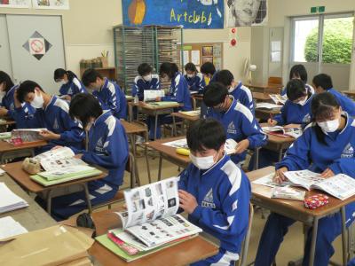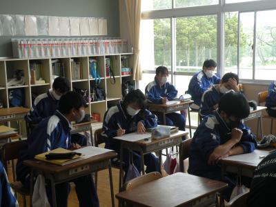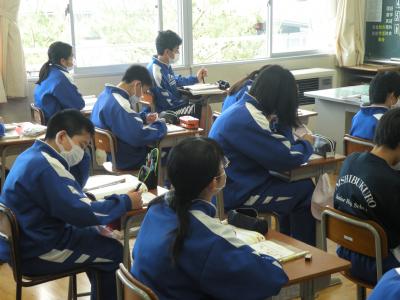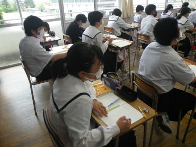 2021年5月24日 10時25分前半はユニット1のテストの答え合わせを、後半は各班で作成したポスターへのALTの先生からのコメント(英文)を理解していました。男女共にとても仲が良く、良い雰囲気の中で授業が進められていました。教科担任の先生の分かりやすい解説(説明)で、生徒たちはよりいっそうやる気を出していました。