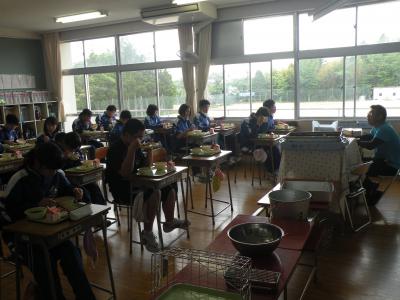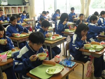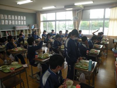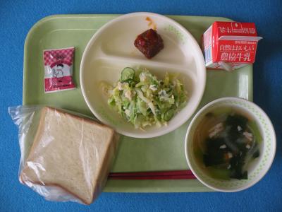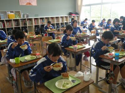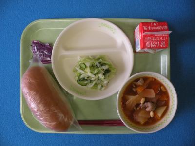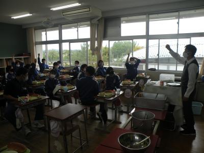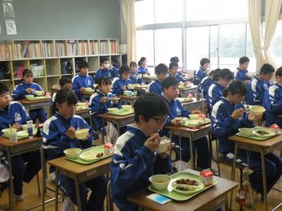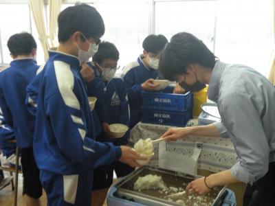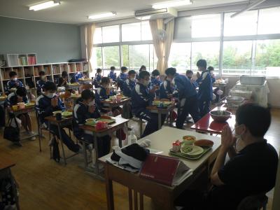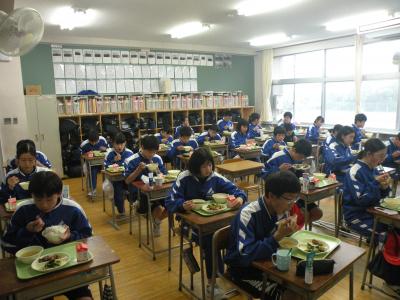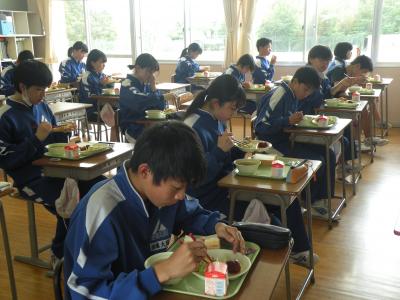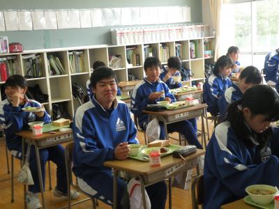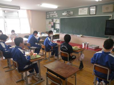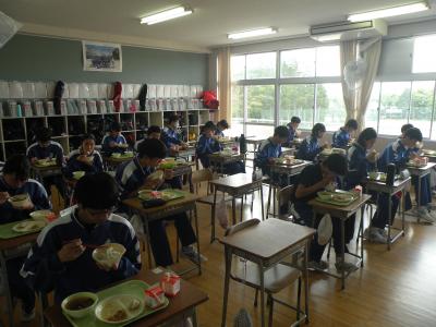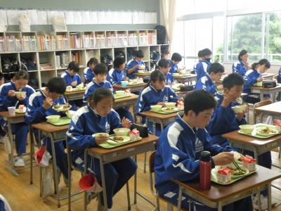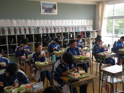 2021年5月18日 12時50分今日のメニューは、コッペパン・ポークビーンズ・グリーンサラダ・ブルーベリージャム・牛乳でした。今日は1年生の教室に伺いました。食欲旺盛、どの生徒もたいへんに元気でした。中学校生活にも慣れた感じを受けます。余った食材はジャンケンで決めているクラスもありました。どのクラスもとても良い雰囲気ですね。