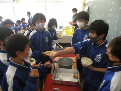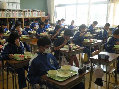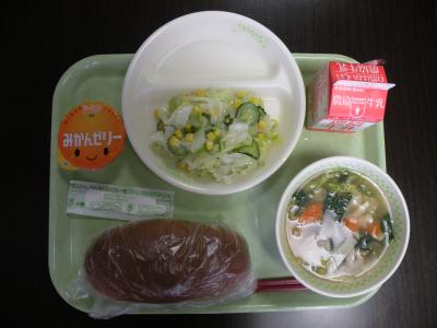 今日のメニューは、黒砂糖コッペパン・水ぎょうざ・コーンサラダ・牛乳・みかんゼリーでした。今日は所用があり、生徒たちの様子は撮影できませんでした。昨日は陸上大会でしたが、生徒たち疲れた様子も見せず、元気に学校生活を送っていました。今日の給食もたいへんに美味しかったです。ご馳走さまでした!