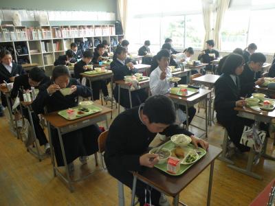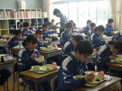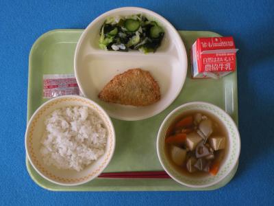 今日のメニューは、麦ごはん・アジフライ・きゅうりの酢の物、おおひら、牛乳でした。おおひら(大平)とは野菜がたっぷり入った山口県東部の郷土料理のようです。今日は2年生の教室を訪問しました。みんな元気にあいさつをしてくれました。食欲も旺盛です。今日もたいへんに美味しかったです。ご馳走さまでした。