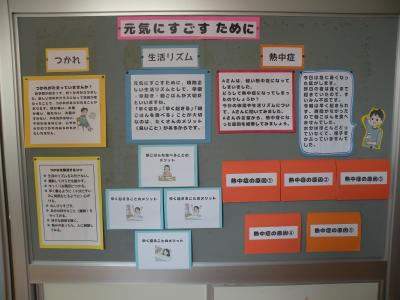 保健室前には本校の養護教諭が作成した「元気にすごすために」の掲示物がお目見えしました。「つかれ」「生活リズム」「熱中症」の3点から具体的な内容で分かりやすくまとめられています。生徒の皆さんもぜひ、読んでみてはいかがでしょうか。「なるほど」と思う点が数多くありました。部活動をするうえで大切なことでもあります。