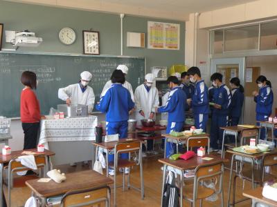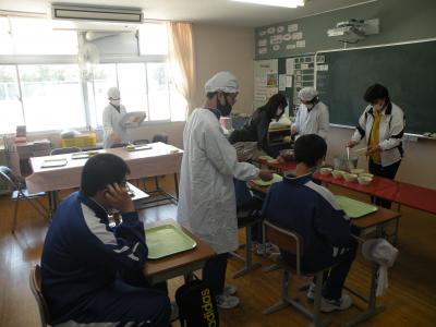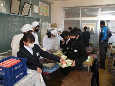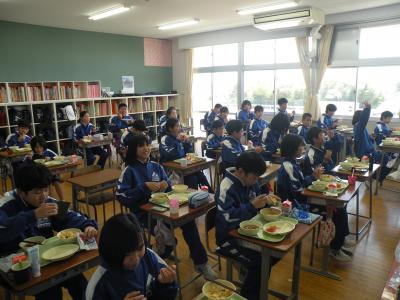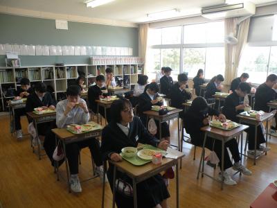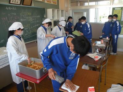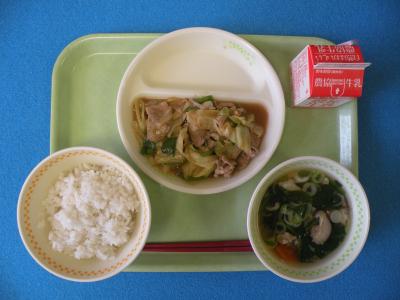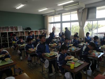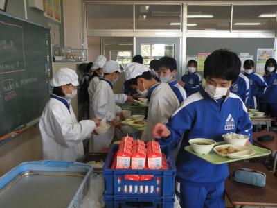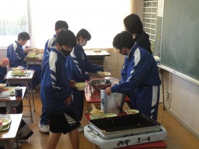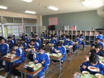 2021年4月26日 12時45分今日のメニューは、麦ごはん・回鍋肉・春雨スープ・牛乳でした。今日は2年生の教室を訪問しました。男女仲良く協力し合って進めていました。ある男子生徒は全生徒の机をきれいに布巾で拭いていました。コロナ感染防止からもとても良いことです。給食でパワーアップし、午後も頑張りましょう。