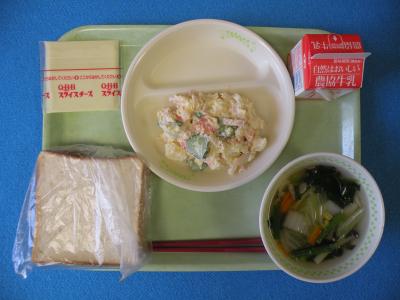 2021年4月27日 12時45分今日のメニューは、サラダサンドパン(食パン・ポテトサラダ)・きのこと野菜のスープ・スライスチーズ・牛乳でした。今日は3年生の教室を訪問しました。食パンとポテトサラダがとても合い、美味しかったです。※明日は1年生がムシテックワールドでの校外学習のため、給食はありません。お弁当を持参させてください。